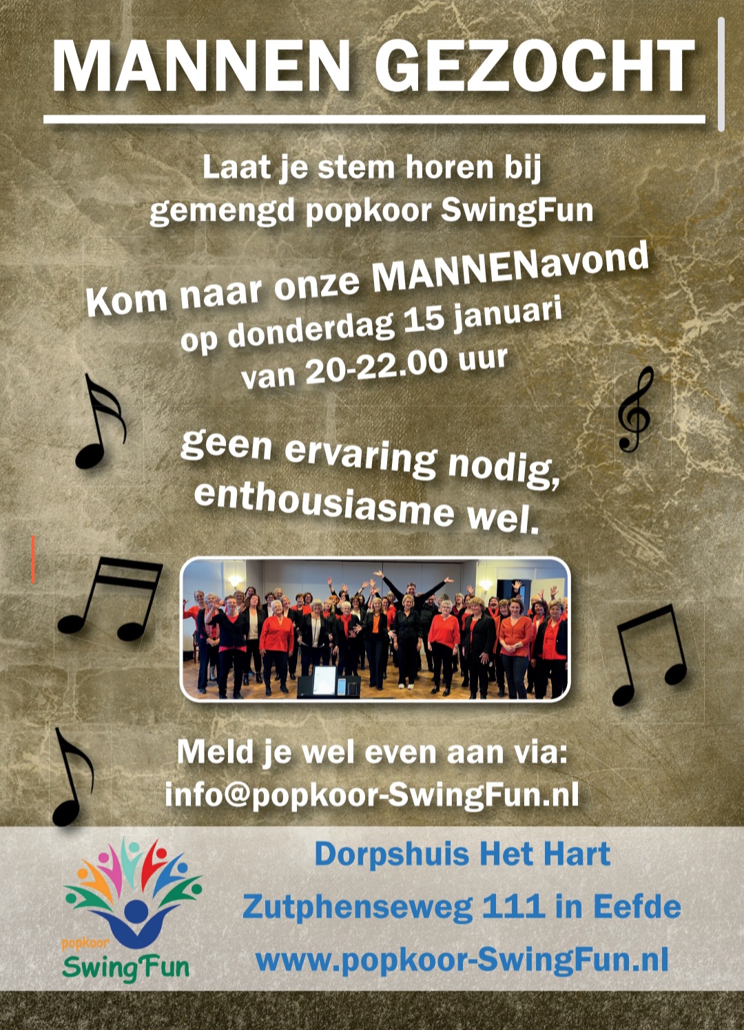 Popkoor SwingFun houdt op donderdagavond 15 januari 2026 een speciale mannenavond.