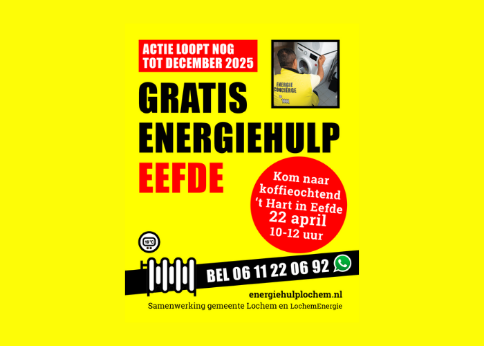 het Hart Eefde Jolinkweg 2, Eefde, NederlandWegens succes herhaald! Bespaar energie én kosten: Kom naar de koffieochtend op 22 april. Heb je vragen over energiebesparing of wil je gratis energiezuinige producten ontvangen? Op dinsdag 22 april van 10.00 - 12.00 uur zijn er twee energieconciërges van Gratis Energiehulp Lochem aanwezig bij de koffieochtend in Dorpshuis het